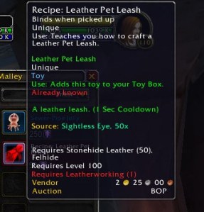 This toy is purely cosmetic and is used to leash your companion pets, it is made by a Leatherworker and can be bought on the Auction House. At the time this was written and on Khaz’Goroth these were selling for around 2000 gold.